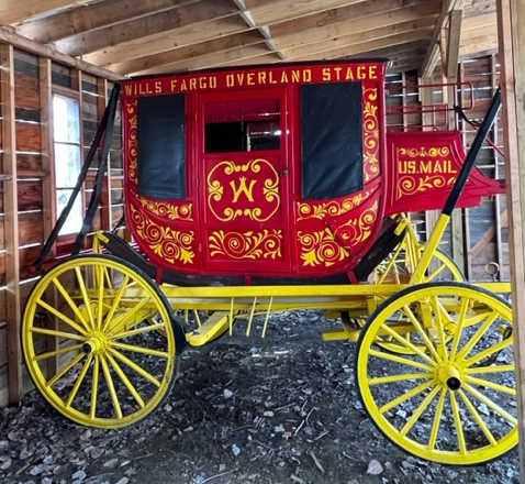 Stagecoach, ideal for a museum, parades or just to have.This is a 3/4 size to scale replica with pole (Dostal) 12' 2" long. Fiberglass commercial duty body, suspended on leather thoroughbraces and metal square tubing construction undercarriage. Comparable asking prices for similar coaches in private sales range from $25,000 to $40,000, but this stagecoach will sell by auction to the highest bidder regardless of price. Auction price is payable in Canadian $.