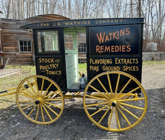 Watkins horse drawn delivery wagons were stocked with general medicine, spices, flavours and general household products. These were sold door to door by the wagon master who was also the salesman.