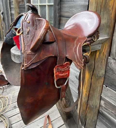 This is an early day high back saddle. It is a well built stock saddle that was popular in its day and has seen a lot of use. The production date of this saddle is unknown, but it may have been in the 1890's. The seat size is 14 inches. Auction price is payable in Canadian $.